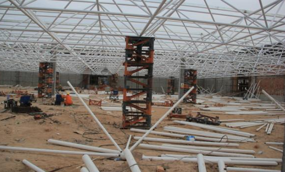 5)总体晋职法:此步履多使用在周边支护以及有多点支护的网架结构,可采取平板升降机、液压千斤顶等小型机具作业辛集施工;